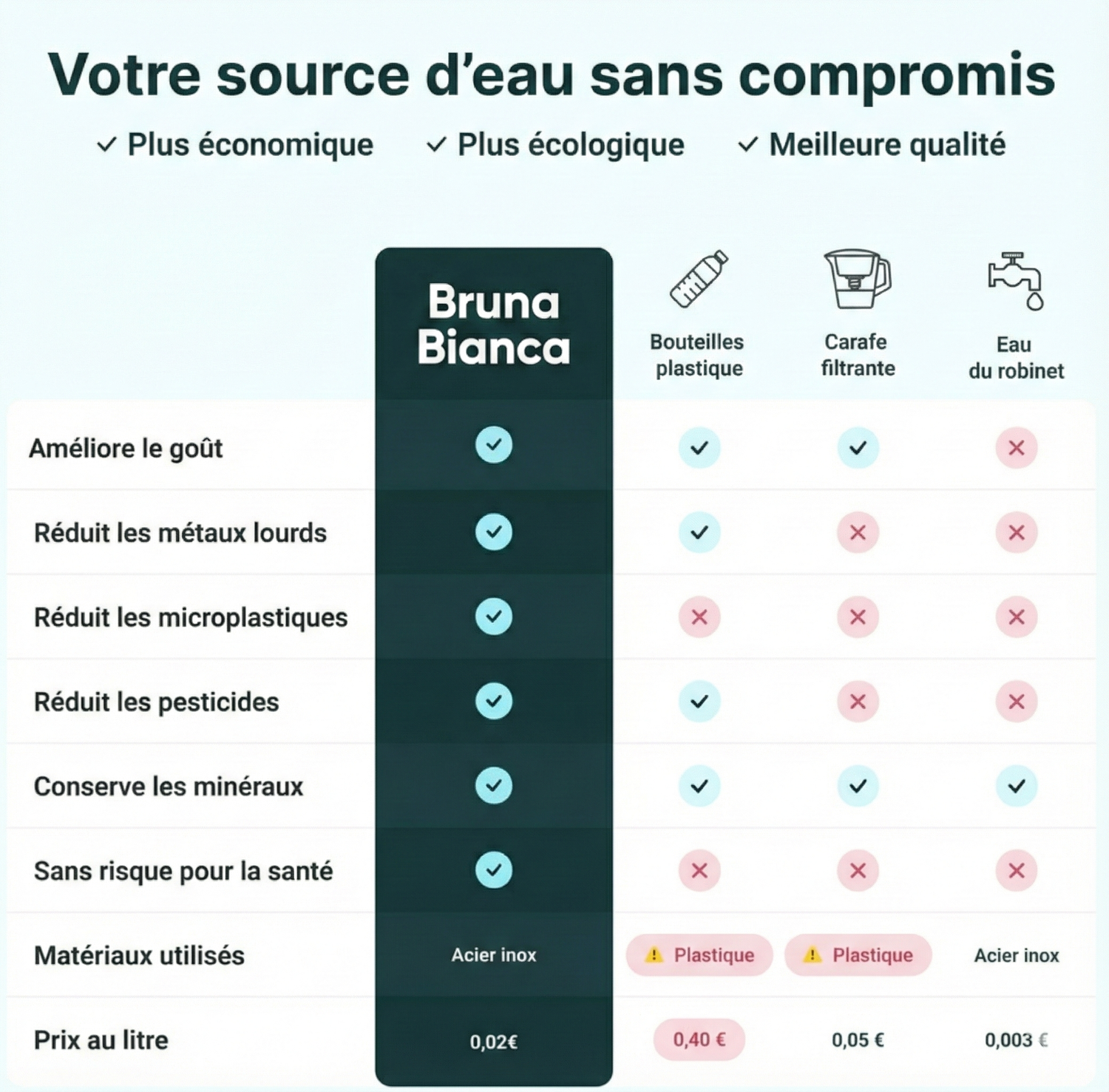 Oui. L’eau filtrée par Bruna Bianca convient parfaitement à un usage quotidien, y compris pour les enfants, les animaux et la cuisine. Elle est saine, agréable au goût et immédiatement disponible.