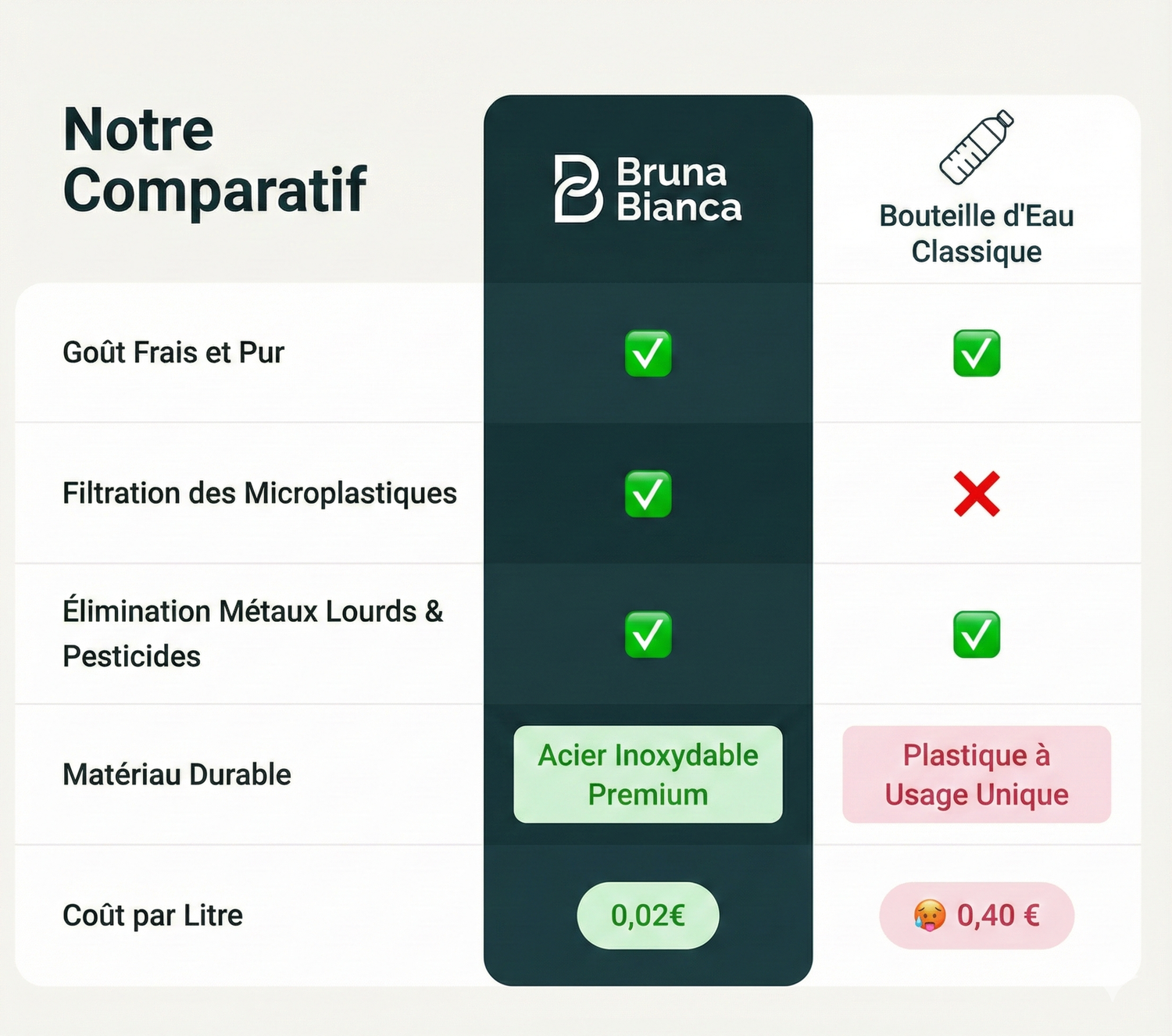 L'eau en bouteille coûte jusqu'à 100 fois plus cher que l'eau filtrée. Arrêtez de payer pour du plastique et passez à l'illimité.